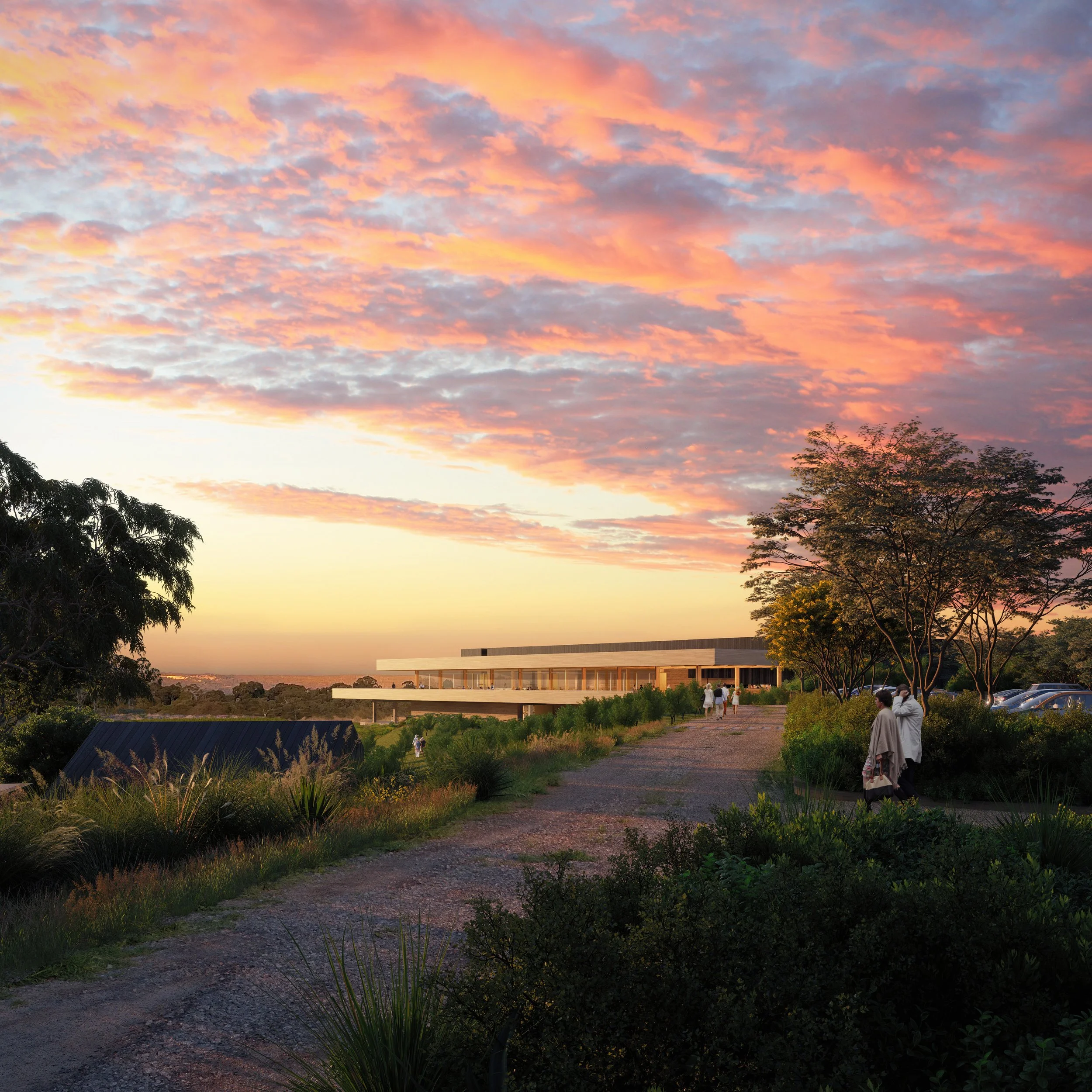 The design proposal for Old Young’s Distillery is on a 50,000m² site next to the Swan River. It includes an expandable gin distillation facility, a hospitality venue, visitor accommodation, and flexible cellaring space, all set within a landscape of native plants, a juniper orchard, botanical gardens, and vineyards